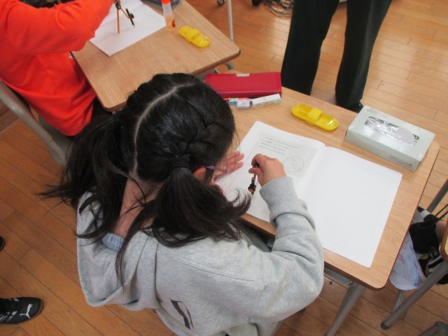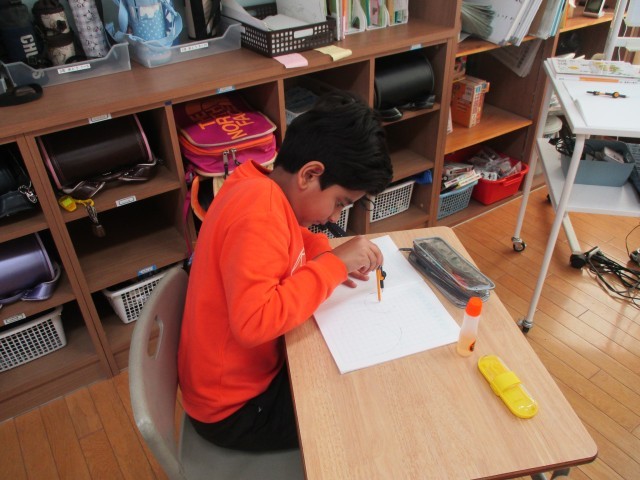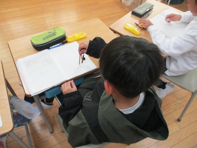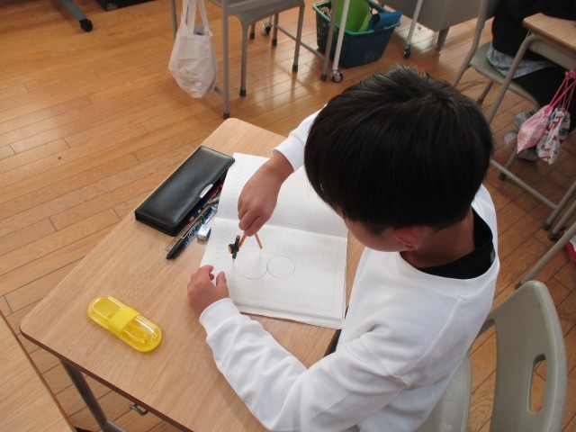 円の学習をしている3年生。今日は、初めてコンパスを使って円を描きます。針とえんぴつの先を揃えるよう調節すること、上の持ち手をつまんで動かすことなど大切なことを聞いた後で、実際に使っていました。はじめは、なめらかに動かすことが難しかったようですが、コツをつかむとスムーズに動かし、きれいな円をかくことができるようになりました。いろいろな大きさの円をかけるようになり、嬉しそうな3年生でした。