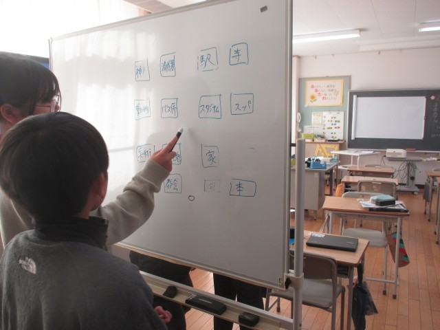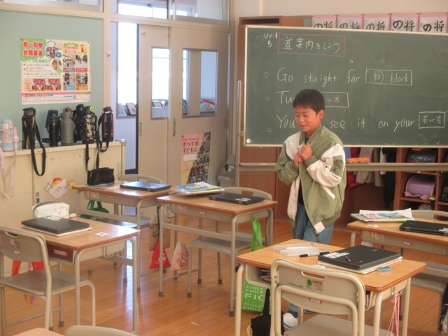 「Go straight.」「Turn right.」「Turn left.」などの表現を使って、教室を町に見立てた活動に取り組みました。子どもたちは地図を見ながら、友達を目的地まで上手に案内していました。