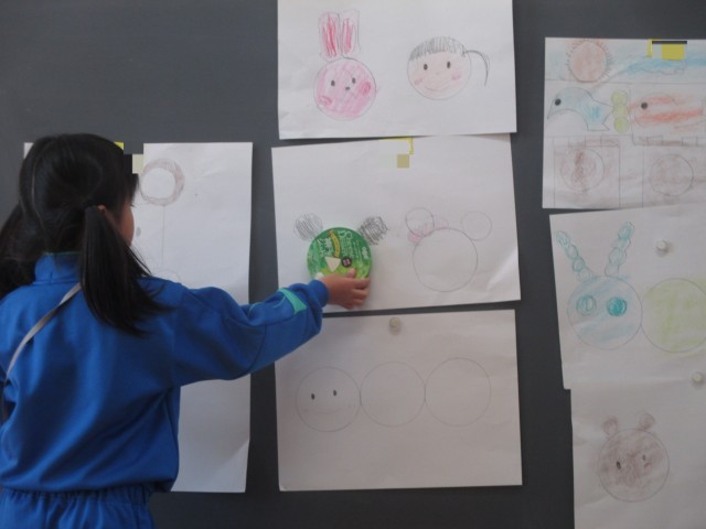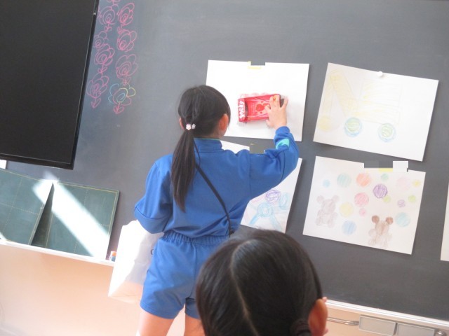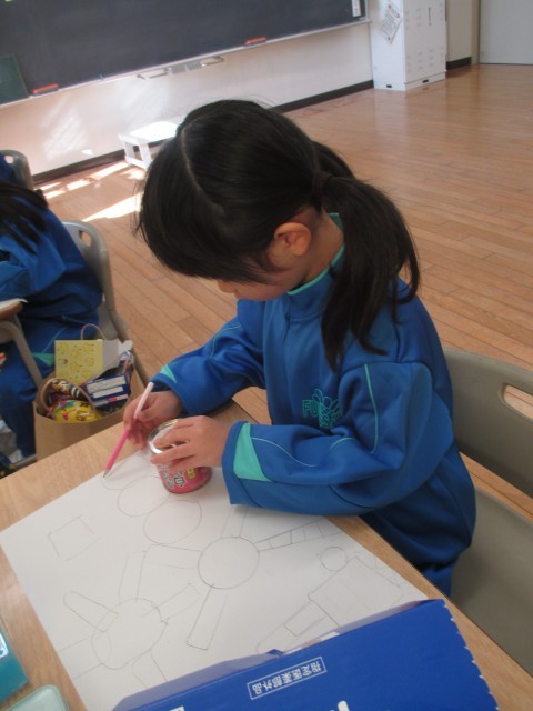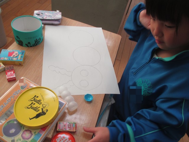 空き箱の形を写し取って絵をかきました。同じ箱でも面によって形が違うことに気付きました。また、どんな空き箱を使ったか説明することもできました。いろいろな形を使ってかくのが楽しかったようでした。