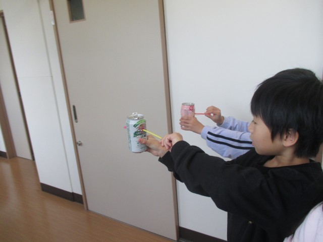 空き缶とストロー、輪ゴムを使って、「ストローアーチェリー」というおもちゃ作りをしました。ゴムの力で動くおもちゃです。完成した後は、実際に飛ばして遊びました。