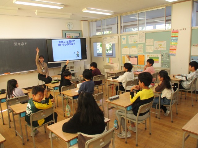 2名の先生に来ていただき、たばこが体に及ぼす影響について教えていただきました。体力が落ち、病気になる可能性があることを知り、子供たちはたばこの恐ろしさを感じていました。これから、周りの人にも伝えていきたいですね。
