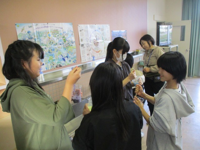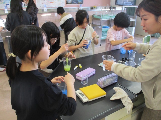 文化クラブは、スライムづくりをしていました。思い思いの色を入れて、一生懸命に混ぜ、伸びるように硬さの調節をしていました。