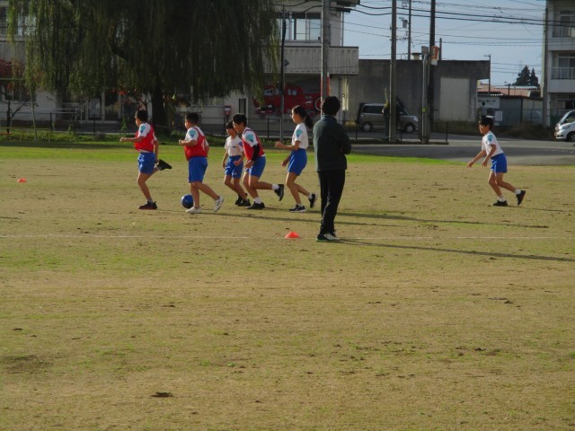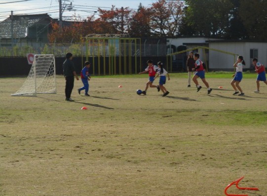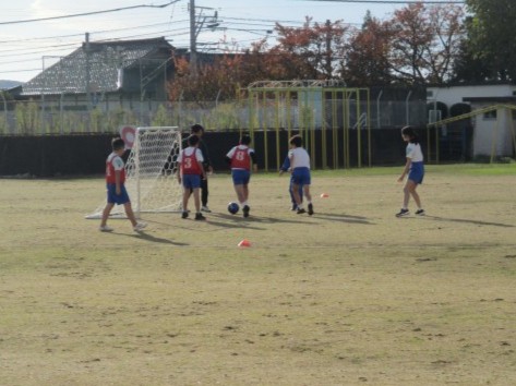 運動クラブは、サッカーです。新しいサッカーゴールを使い、パスを回しながらゴールを目指していました。