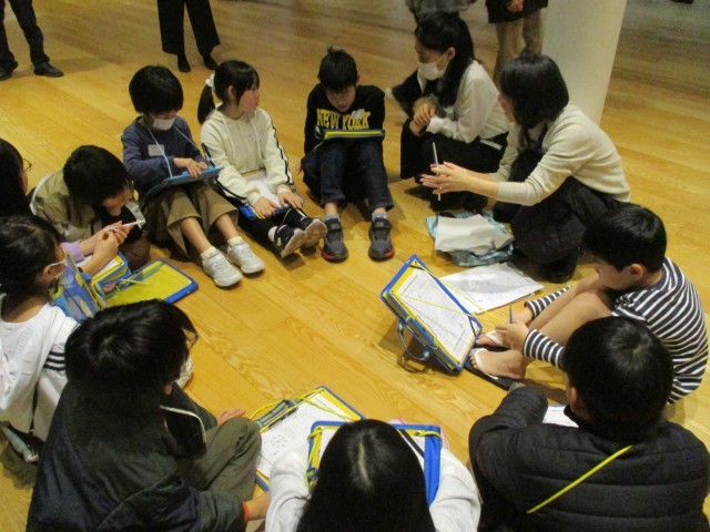 その後、いくつかの作品を見た中から自分のお気に入りの作品を選び、その作品の様子やお気に入りポイントなどを言葉で表しました。お互いに友達の発表も聴き合いました。あっという間に時間が過ぎたので、「もっと見たいなあ」と残念そうな4年生でした。
