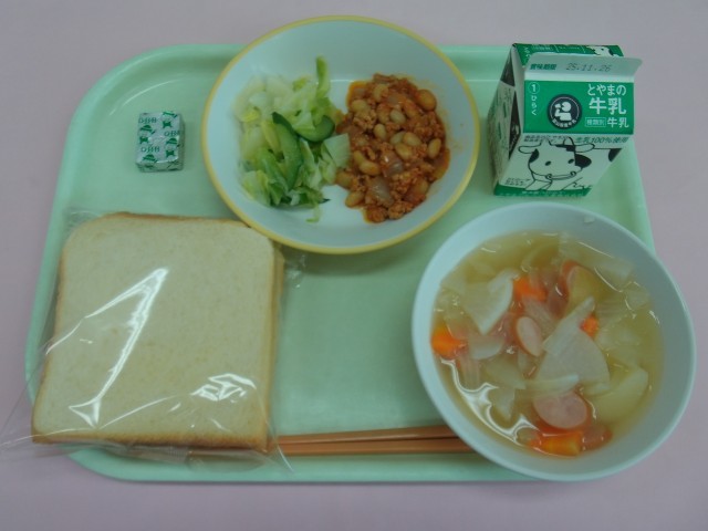 チリコンカンは、ひき肉、豆、トマト、スパイスを煮込んだシチューで、テキサス州発祥のメキシコ風アメリカ料理だそうです。スペイン語で「唐辛子(チリ)と肉(カルネ)」が語源だと言われています。給食は、辛みはなくトマトケチャップ、塩、コショウで味付けされています。