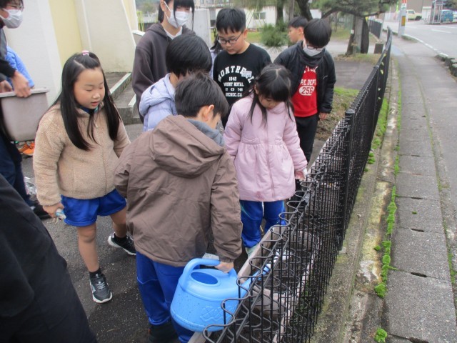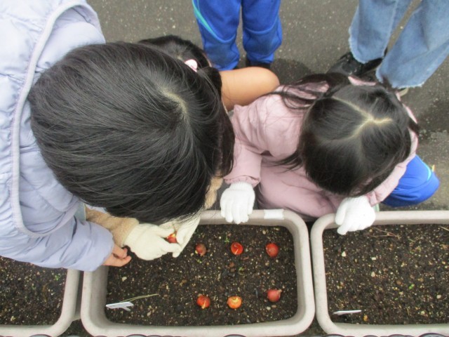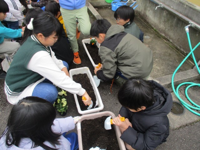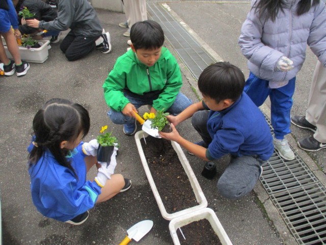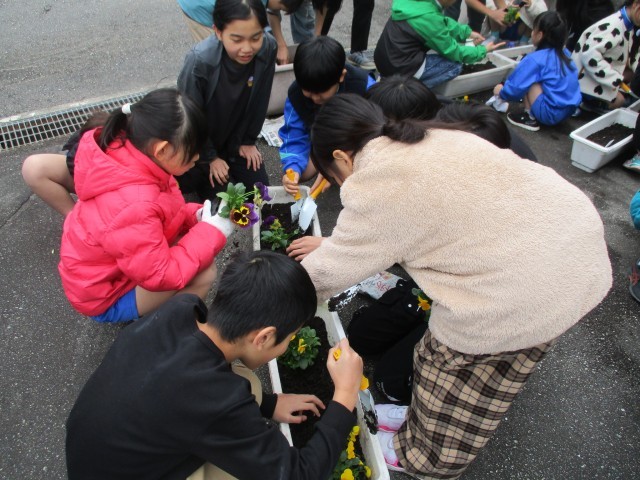 ファミリー班で花苗を育てていきます。今日は、パンジーとビオラの苗と、チューリップの球根を班のみんなと協力しながら植えました。春になり、きれいな花が咲くのを楽しみにしながら、これから、みんなでお世話をがんばっていきましょう。