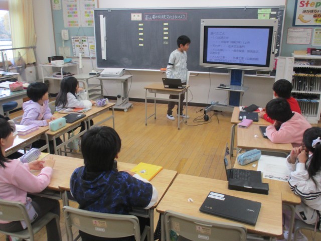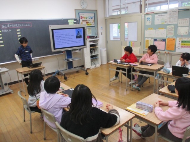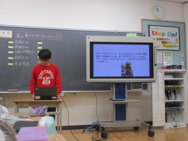 富山県の伝統文化や昔から受け継がれているものについて、一人一人が関心をもった内容をスライドにまとめて発表しました。友達の発表を聞く中で、どれも昔の人の思いや願いが込められていることや、大切にされていることを感じた子供たちでした。