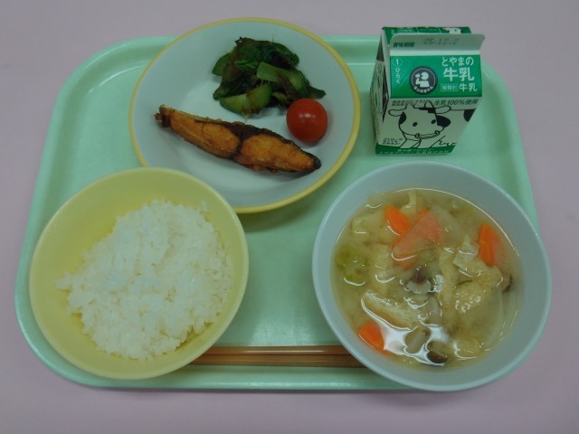 今日は、学校給食とやまの日です。富山県産の食べ物は、ごはん、ふくらぎ、小松菜、だいこん、にんじん、ねぎ、牛乳です。みそ汁の中には、みょうがも入っていました。5、6年生でも、「知らない、食べたことがない」と言っていた子供が多かったです。給食では、ほんのり味を感じる程度だったので、みょうがの味を子供たちは感じられたでしょうか。