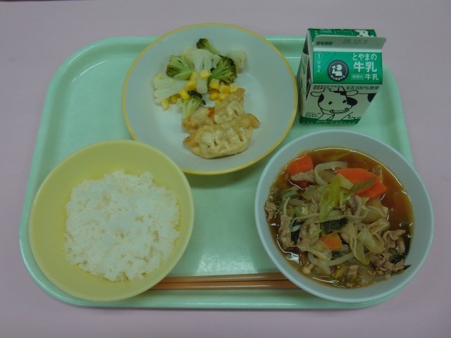すき焼きには、豚肉の他に、玉ねぎ、にんじん、つきこんにゃく、焼き豆腐、白菜、ねぎ、えのきだけが入っています。「韓国風」ということで、普段の調味料の他に、にんにく、しょうが、ごま油、一味唐辛子も加えて調理されました。体がぽかぽか温まりました。