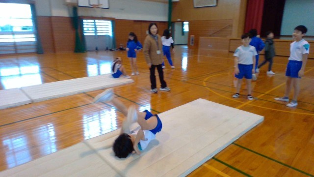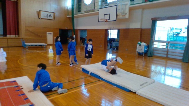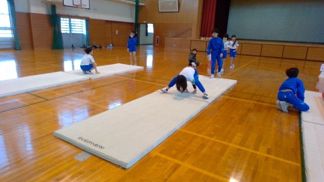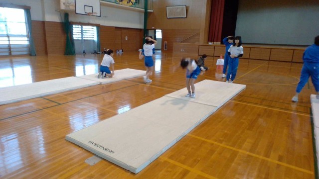 体育科では、マット運動の学習をしています。今日は回転技に挑戦です。前転、後転、大きい前転、開脚前転、開脚後転にチャレンジしています。最後の起き上がりまでしっかりとできるように意識し、自分に合った場を選びながら練習してます。
