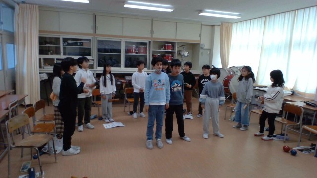 みんなで「いろんな木の実」を歌いました。歌うところ、リズムよく楽器を鳴らすところなど、一人一人の役割があります。明るい歌声と、いろいろな楽器の音色が混ざり、音楽室は楽しい雰囲気でいっぱいでした。