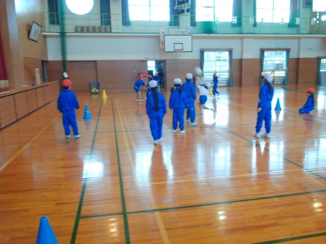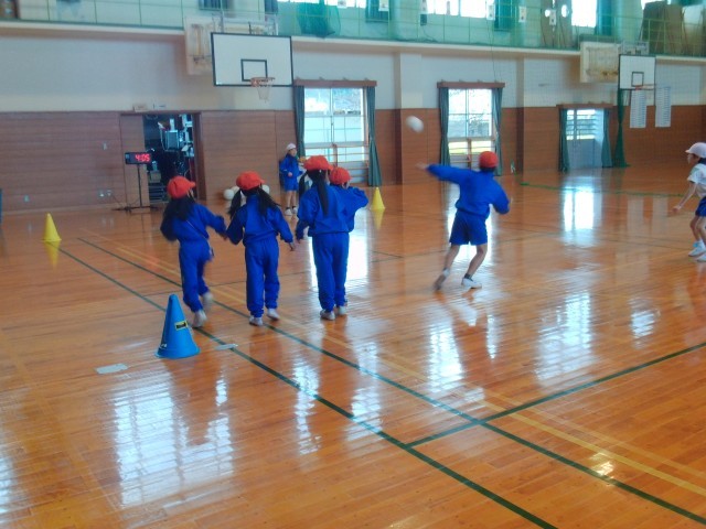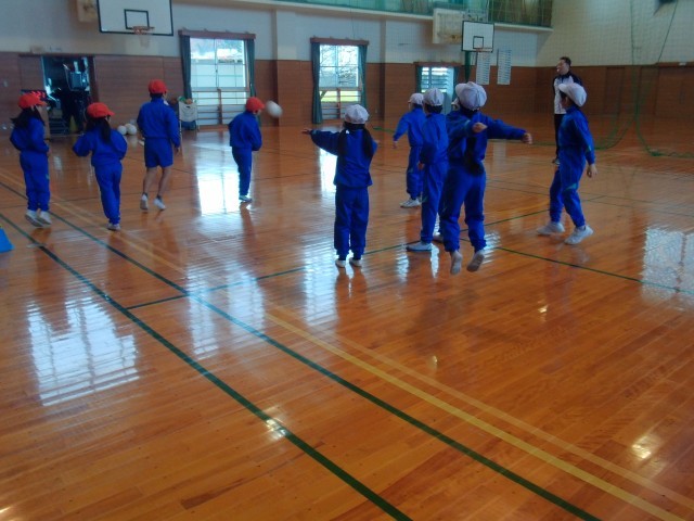 1、2年生は、体育科の時間にドッジボールをしました。相手チームの子に当てようとねらいを定めたり、当たらないようにうまくかわしたりしながらゲームを進めていました。