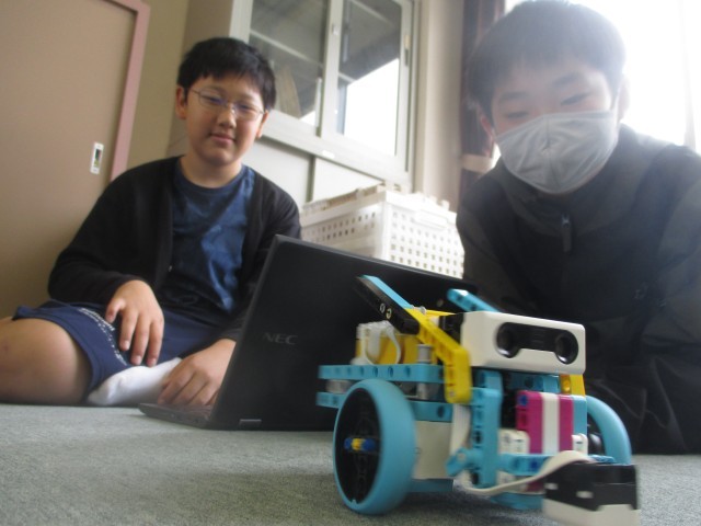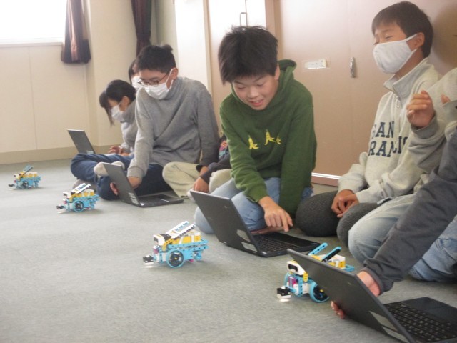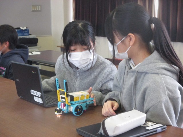 クロムブックを使って、車にプログラムをし、ミッション達成を目指しました。どのようにプログラムをすれば車が進んでいくのか、友達と相談しながら、取り組んでいました。熱心に考えを伝え合う姿やあきらめず何度も挑戦する姿がたくさん見られました。
