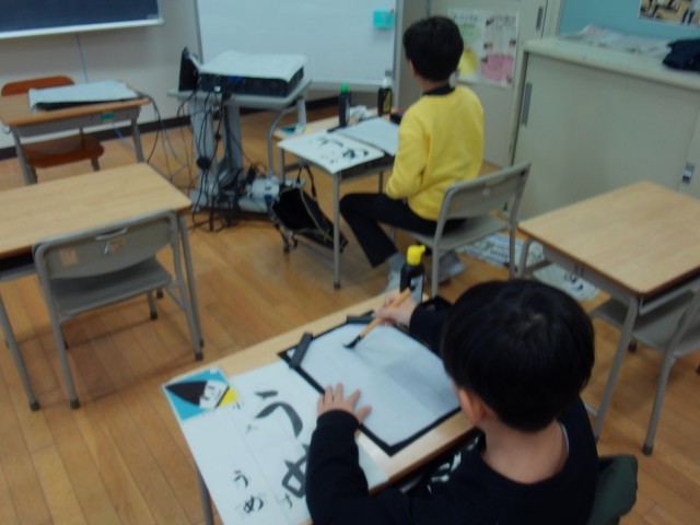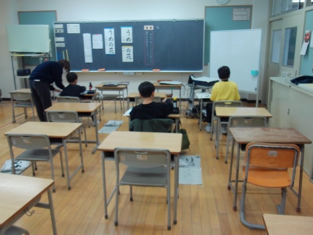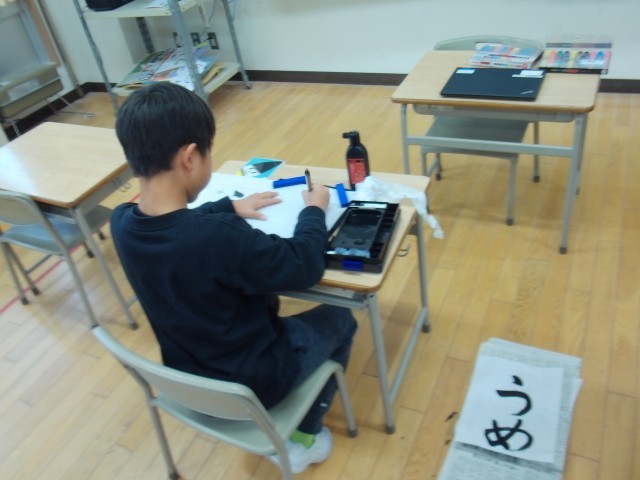3年生は、初めての書き初めに挑戦します。書き初め用の長い用紙に書きますが、3年生は初めてなので、今日は、いつも使っている半紙に書いてみました。「うめの花」と書きますが、「め」も「の」も筆遣いが難しいと感じながらも、一生懸命に練習していました。