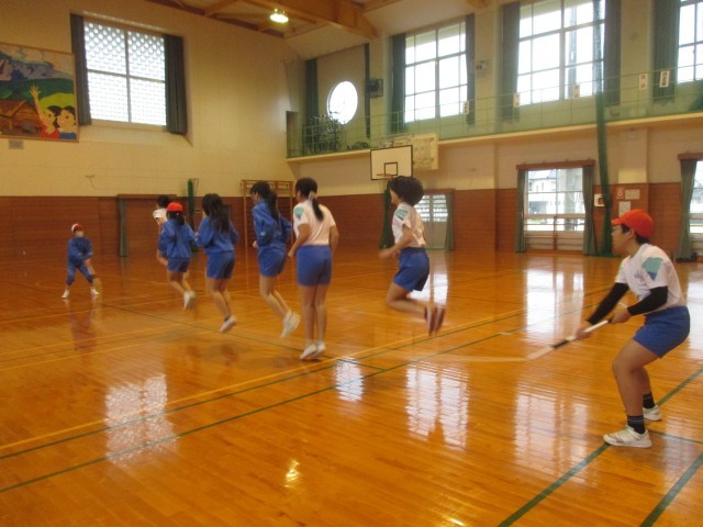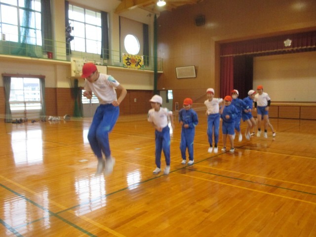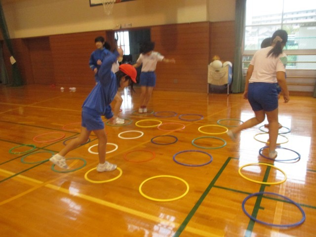 体育科の学習では、大繩跳びやフラフープを使った体つくりの運動を行いました。