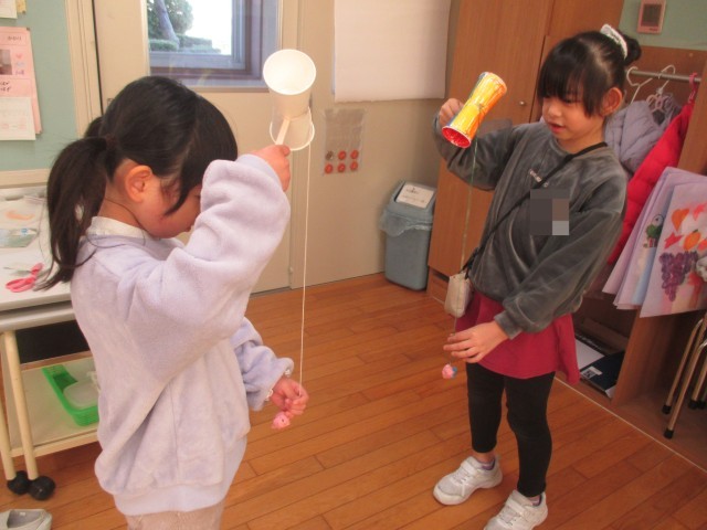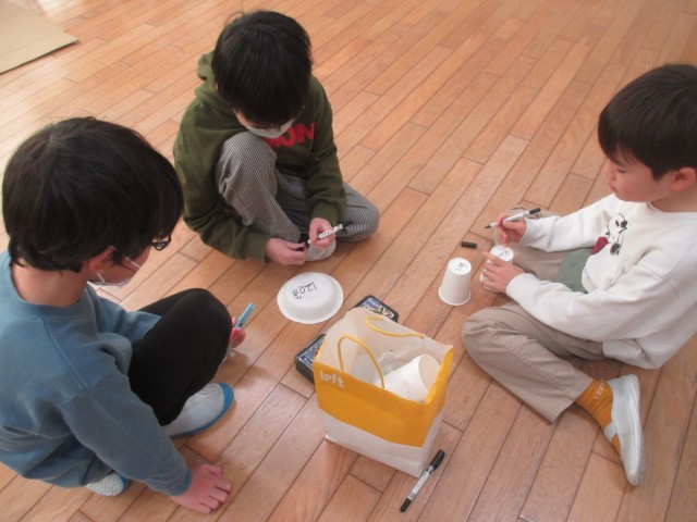 1年生は秋の木の実などを使ったおもちゃ作り、2年生は風やゴムで動くおもちゃ作りをしています。友達と教え合ったり、試行錯誤したりしながら、楽しいおもちゃができあがっています。
