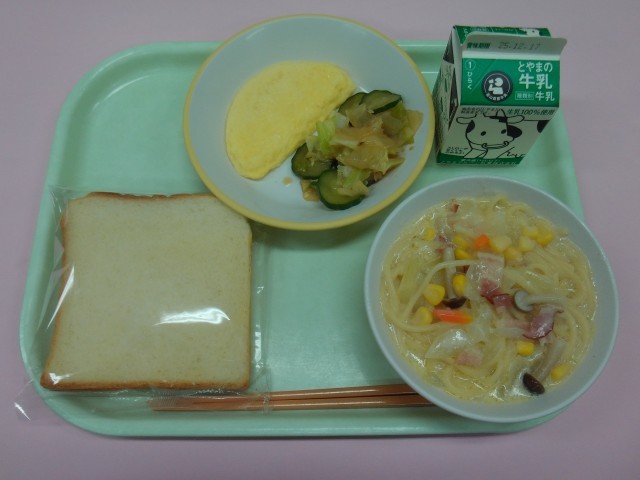 クリームスパゲティは、たまねぎ、にんじん、ベーコン、しめじ、スイートコーンと具だくさんで、しかも、調理員さん特製のクリームソースの味が格別でおいしくいただきました。