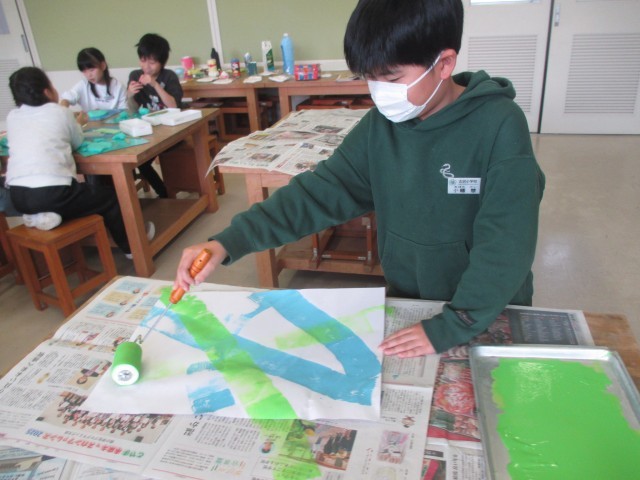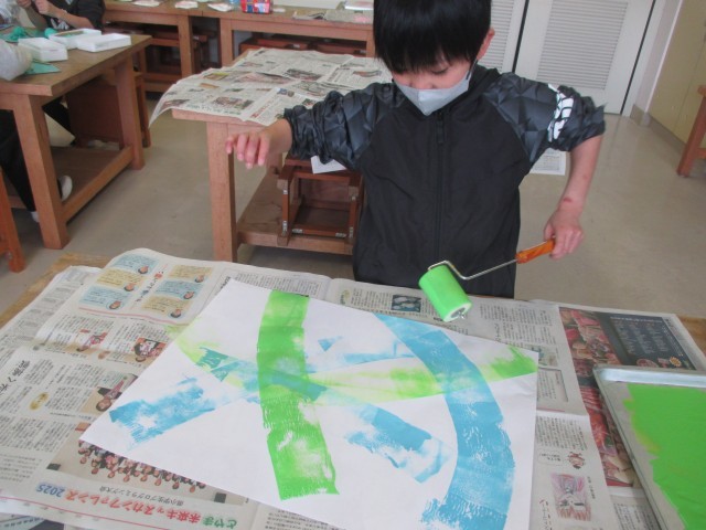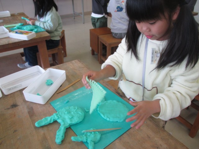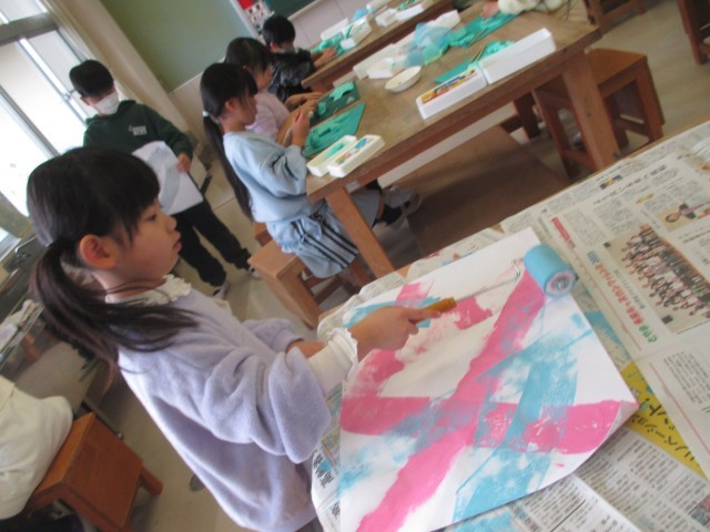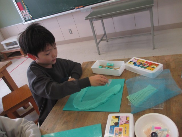 1・2年生は、版画の学習を始めています。ローラーで線を描いたり、あぶら粘土で生き物を作り、さまざまな素材で模様を付けたりました。3学期になったら、紙粘土で版を作ります。楽しみですね。