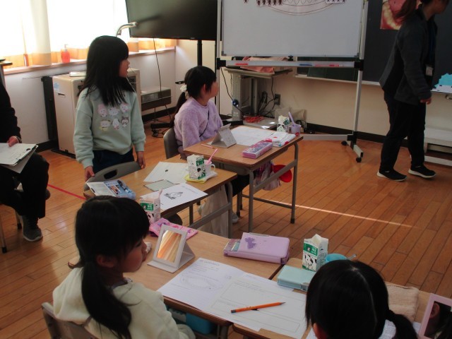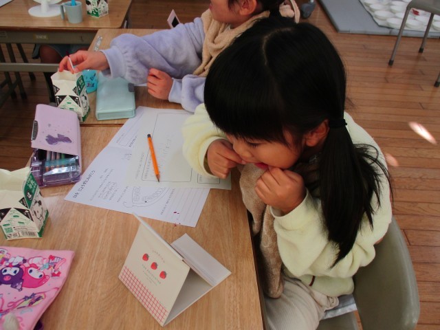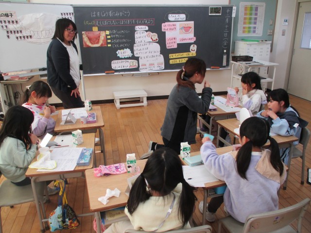 養護教諭と、歯についての学習を行いました。大事な第一大臼歯が生える時期であることから、むし歯にならないための歯磨きの仕方を教わりました。歯の汚れを染め出してみると、「溝のところに赤色が付いた」と気付き、「20回磨きたい」「3分間がんばりたい」と話す子供たちでした。