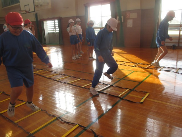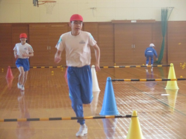 体育科では、体の動きを高める運動に取り組んでいます。障害物を跳んだり、避けたりしながら走るサーキットトレーニングなど、友達と声をかけ合い、楽しみながら取り組んでいました。