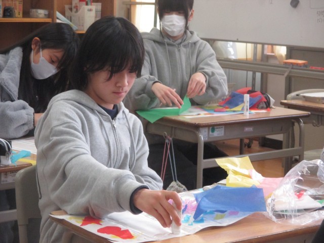 色紙を貼り合わせ、いろいろな形が生まれる明かりを工夫して作っています。季節の明かりや模様の明かり、動物の明かりなど、すてきな作品ができ上がっていました。