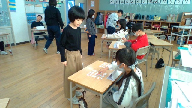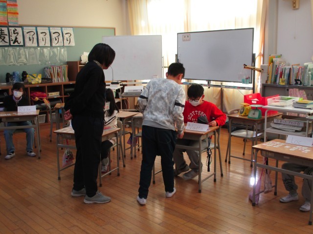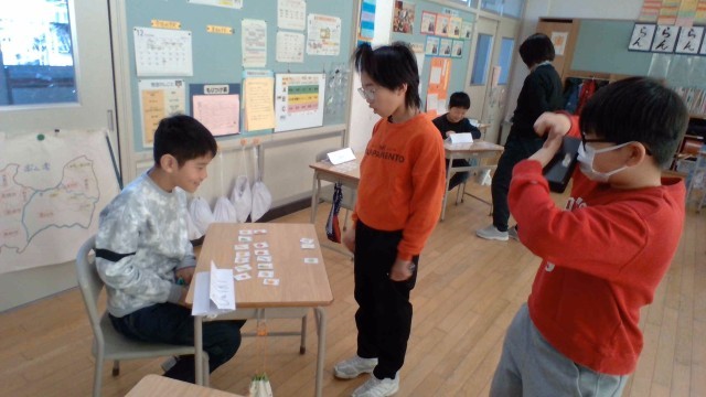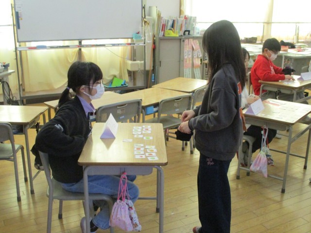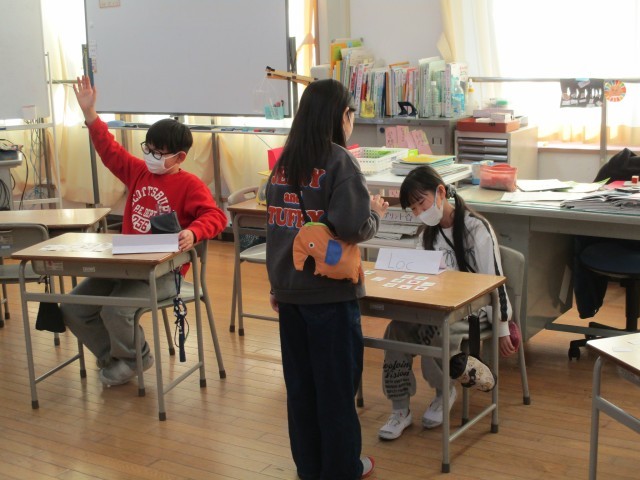 4年生は「What do you want?」の表現を使って、好きな物を尋ねたり答えたりする会話をしています。今日は、野菜や果物を買う場面を設定し、店員とお客さんに分かれて、会話を楽しみました。