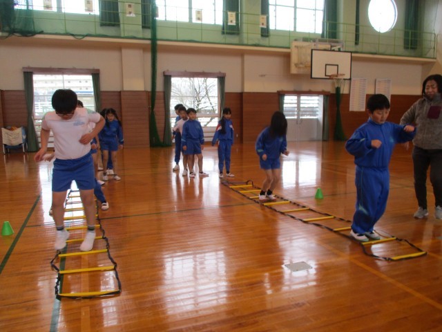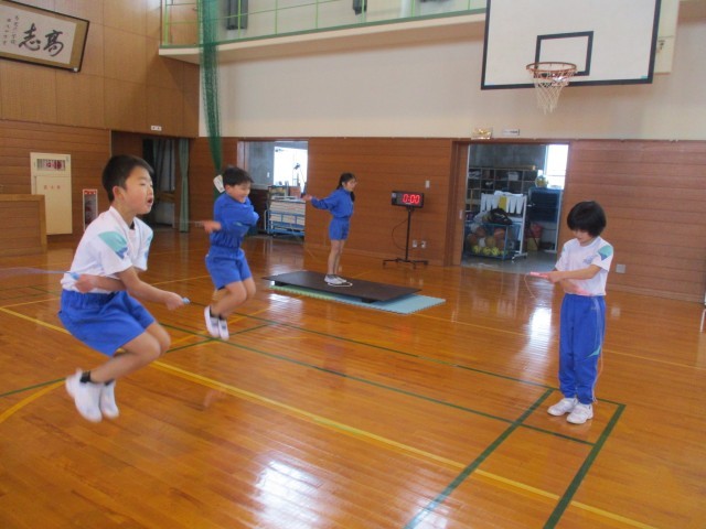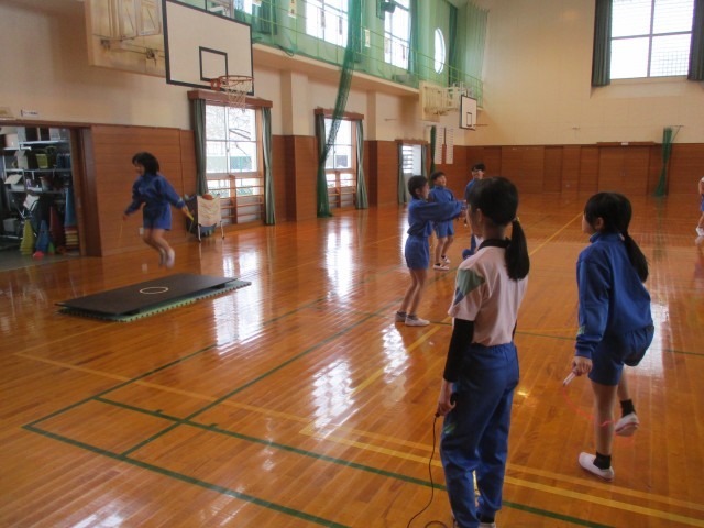 3学期の体育の学習がスタートしました。寒い体育館だったので、最初は体を温めるために3分間走やラダーでのウォーミングアップをしました。後半は短縄跳びです。ペアで回数を数え合いながら、いろいろな技にチャレンジしています。