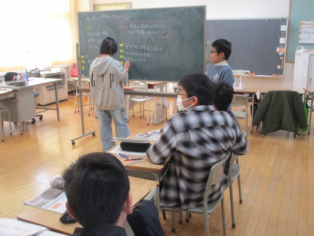 6年生は、学習リーダーが話合いを進めています。出された意見は記録し、自分たちで授業を進めていました。自分の考えをしっかりともち、それを伝え、友達の考えと比べながら、活発に意見を関わらせる姿は、さすが6年生です。