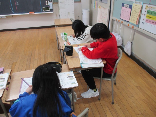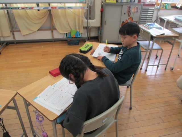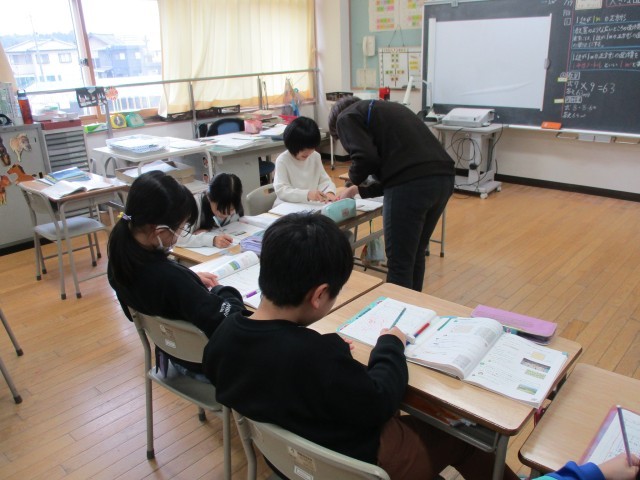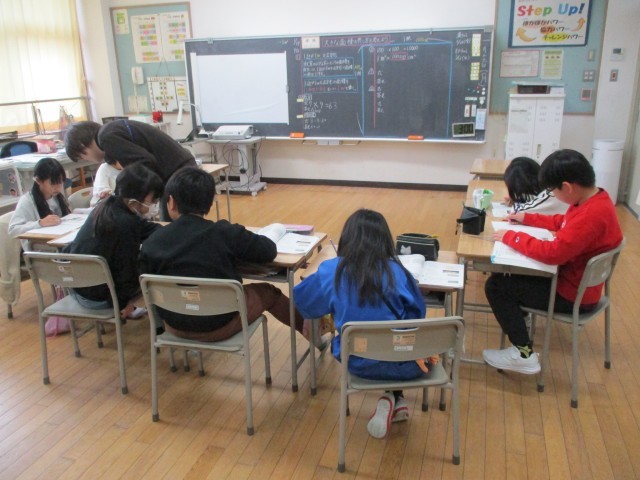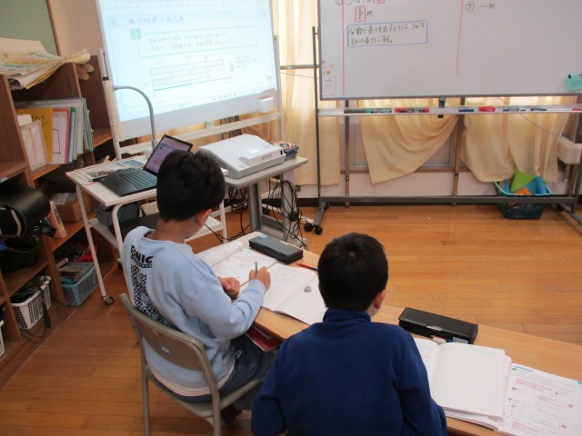 3年生は分数について、4年生は面積について学習しています。どちらの学年も、大事なポイントをしっかりと覚え、問題に取り組んでいます。いつも真剣に、集中して取り組むことができます。