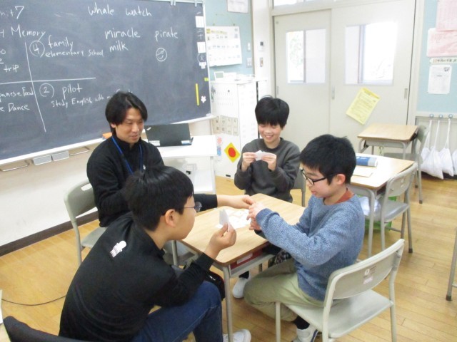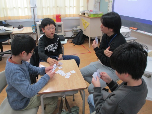 6年生は、外国語科の時間に、アルファベットのカードでババ抜き風のゲームをしていました。アルファベットの大文字、小文字が合えば手持ちから抜いていきます。ババは最後まで分からないので、ドキドキしながらゲームを行い、楽しくアルファベットを覚えています。