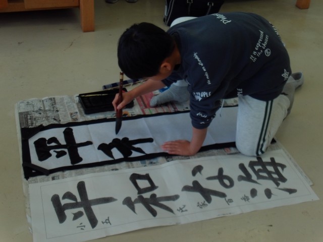 いつも使っている筆より大きな筆を使い、一回り大きな用紙に書いていきます。手本をよく見ながら1画1画丁寧に書いていました。これからの練習もがんばりましょう。