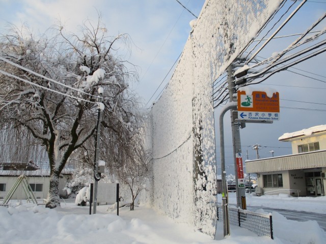 土日に降った雪が積もり、柳の木やネットにも雪が付いて真っ白になっていました。また、気温も氷点下まで下がり、道路も凍っていました。そんな厳しい寒さの中、がんばって歩いて登校してきました。