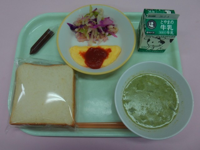 今日は図工の献立です。オムレツの黄色、トマトソースの赤、紫キャベツの紫、ほうれん草の緑など、カラフルな献立です。献立の色を楽しみながら、おいしくいただきました。