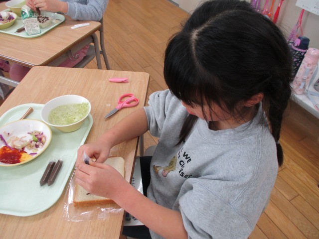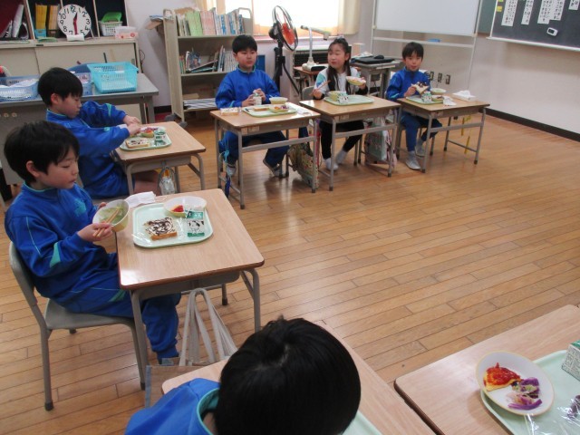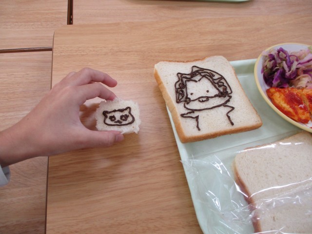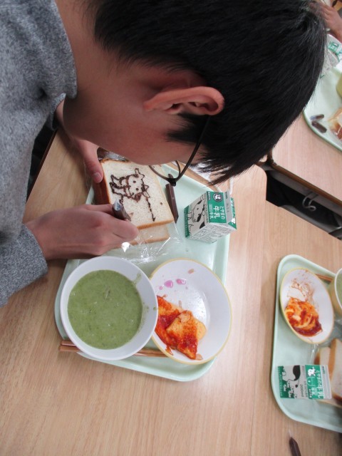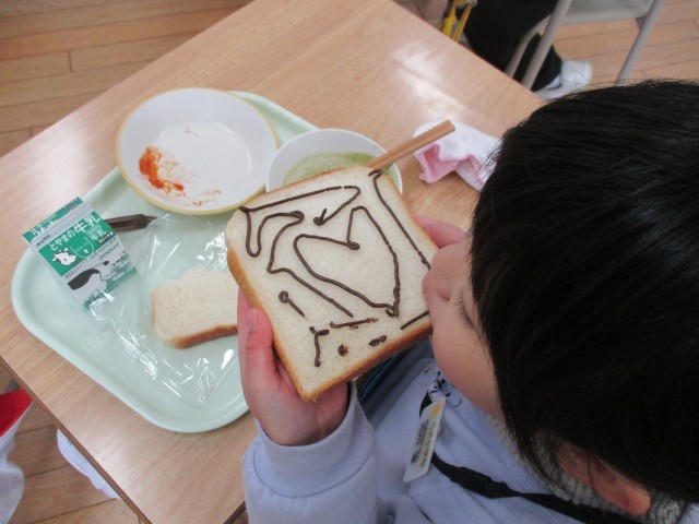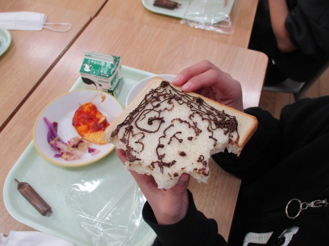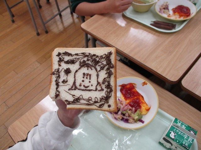 今日の給食は、図工の献立でした。チョコペンが付いていたので、食パンを画用紙に見立てて、それぞれ思い思いの絵を描いていました。たくさんの素敵な作品ができました。食べるのがもったいないですね。