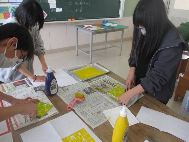 図画工作科で一版連結版画を進めています。今日は、彫った版にインクをつけ、刷る作業をしました。