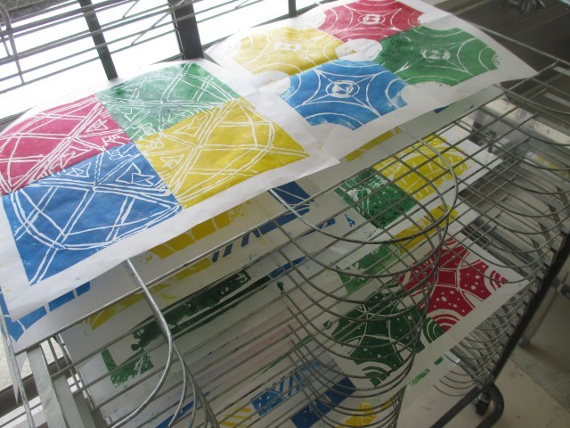 自分の作品のイメージに合う色を選んだり、彫った線がしっかりつながるように慎重に版と紙を合わせたりしていました。色とりどりの模様の版画が出来上がりました。5・6年教室前に掲示しますので、学習参観日にぜひご覧ください。