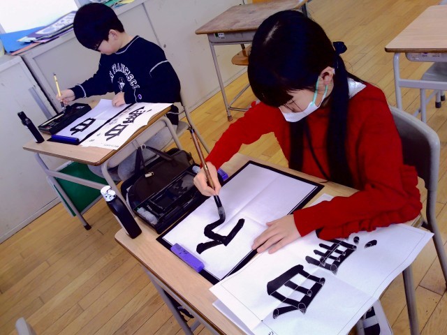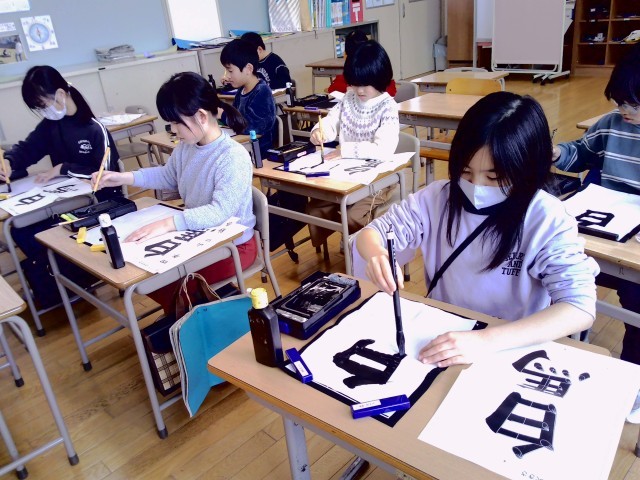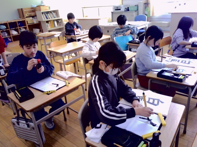 書写では、漢字どうしの大きさを意識して「白馬」という字を書いています。お手本をよく見て、じっくり取り組んでいます。