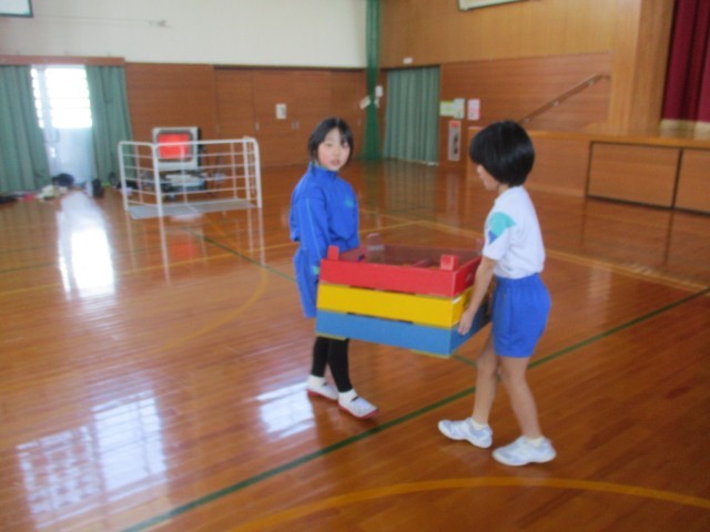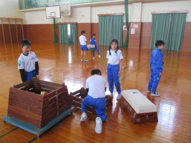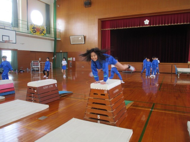 体育では跳び箱運動をしています。自分に合う場を選んで「トン・パン・ピタッ」のリズムで跳ぶことができるように練習をしています。準備や片付けも、みんなで協力しながらスムーズに行っています。