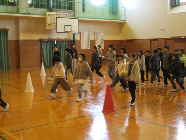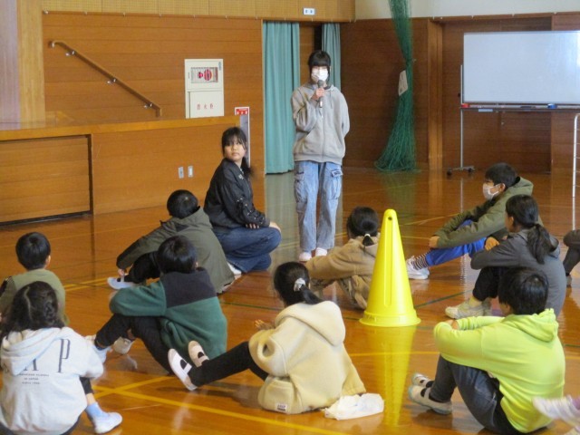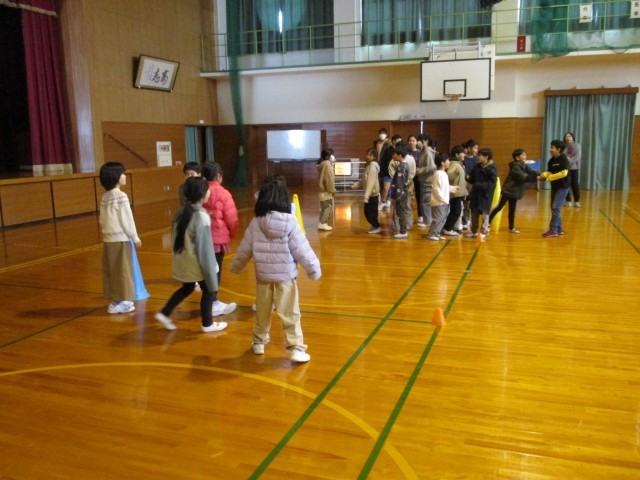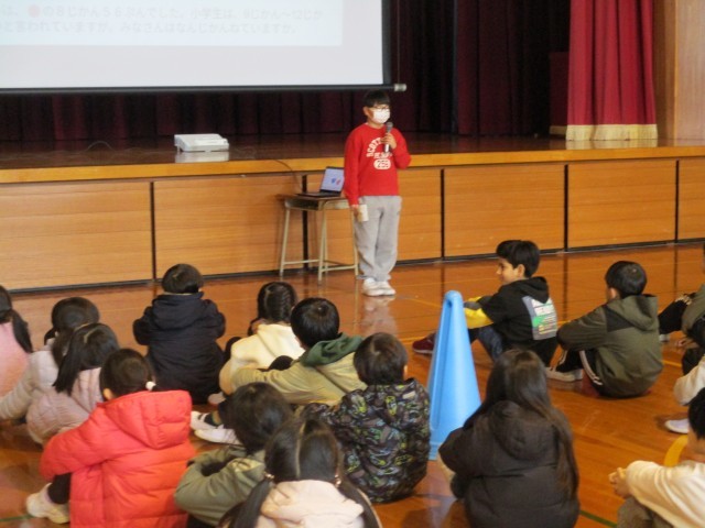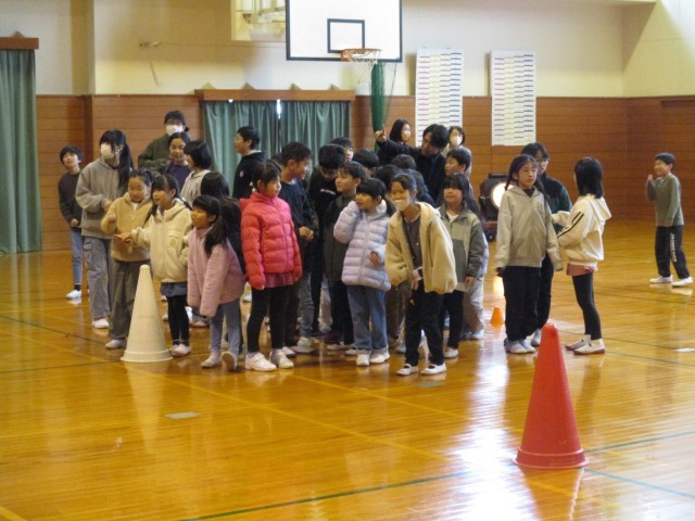 環境・保健委員会の子供たちが「みんなに広めたい、知ってほしいこと」を4択クイズにしました。赤、白、青、黄の4つの選択肢から答えだと思う色のコーンの周りに集まるというルールです。ただクイズに答えるだけでなく、体を動かしながら楽しく参加することができました。クイズの解答数によってジャンプの数も違い、体も暖かくなりました。