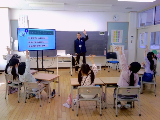 今日は、富山県警察少年サポートセンターの方に「くもくん教室」をしていただきました。「プライベートゾーンは自分だけの大切な場所」であることや、もし何かあった場合には「やめて」と伝えたり、信頼できる大人に話したりすることが大切だと教えていただきました。真剣な表情で話を聞き、最後のクイズに正解するとうれしそうな1年生でした。