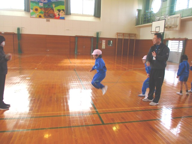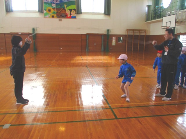 1、2年生は、八の字跳びに取り組んでいました。間を空けずに跳ぶことが難しい子もいますが、縄の中に入るタイミングは練習していくと、だんだん上手くなってきました。前の人に続けて跳ぶことができるように、がんばっていました。