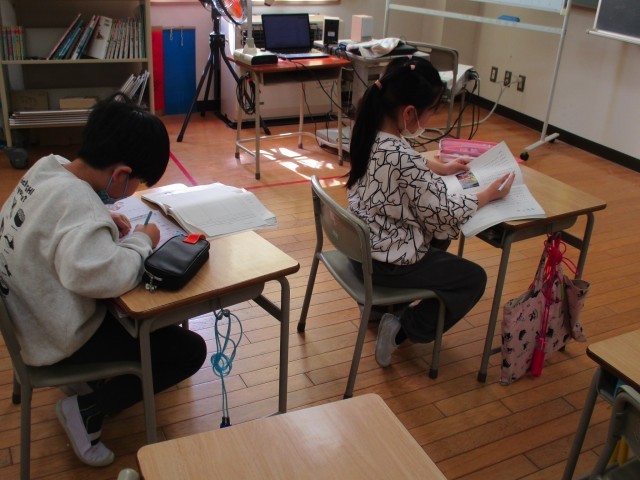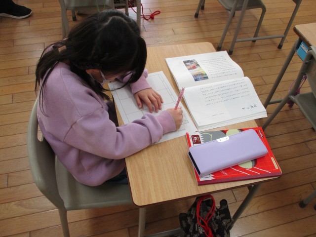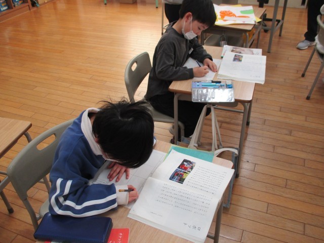 説明文の筆者の問いを見付け、それについて答えている文を読んで、プリントに書いていました。今日は欠席する子が多いですが、真剣にがんばっています。