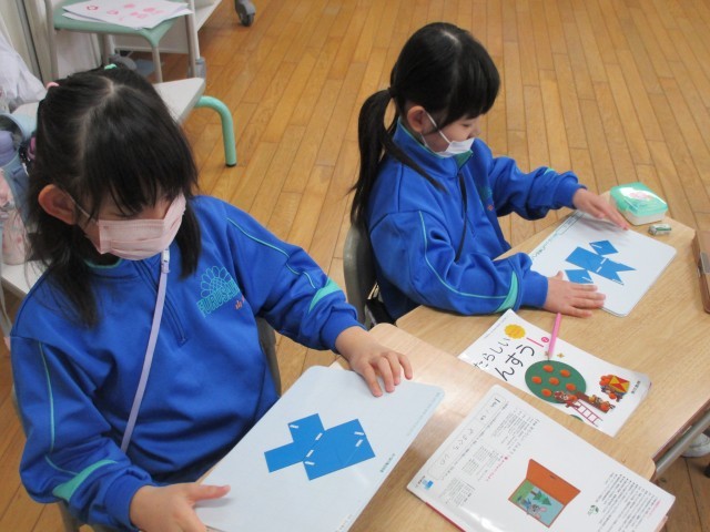 色板を組み合わせて並べ、いろいろな形をつくっていました。