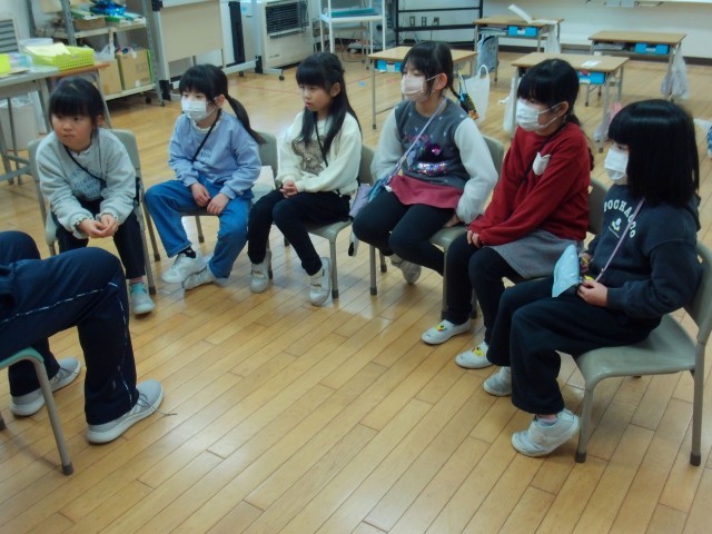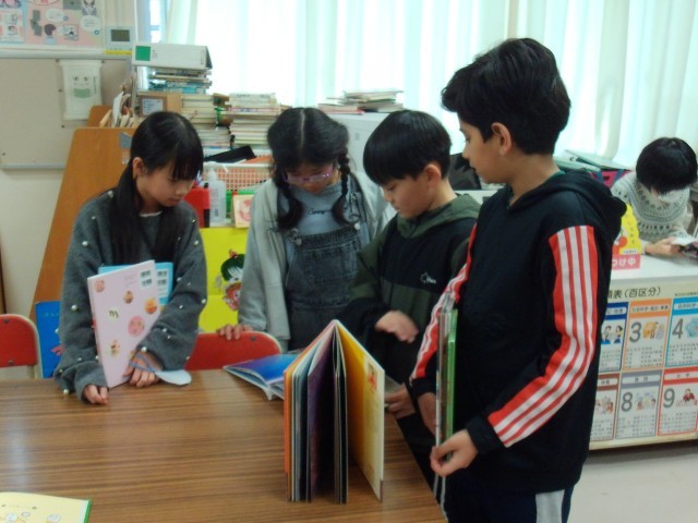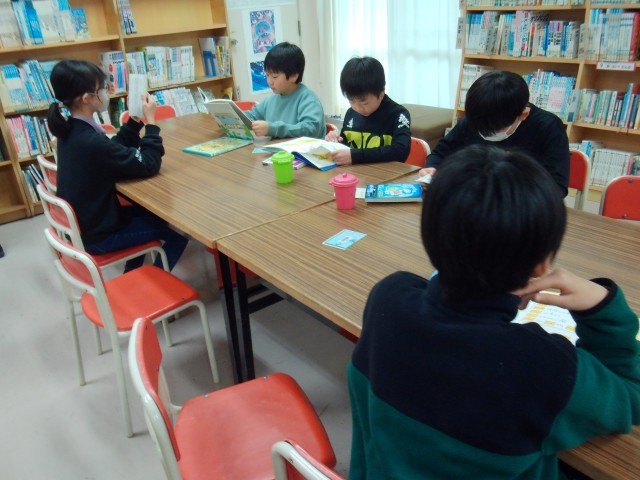 また、3、4年生は、司書の先生の読み聞かせの後、図書室の本を選んで読書をしていました。本棚に、道徳で学習した話の本を見付けたようです。その本の内容について思い出して、本の内容と比べながら話していました。