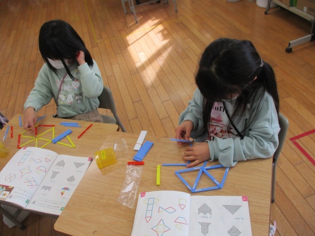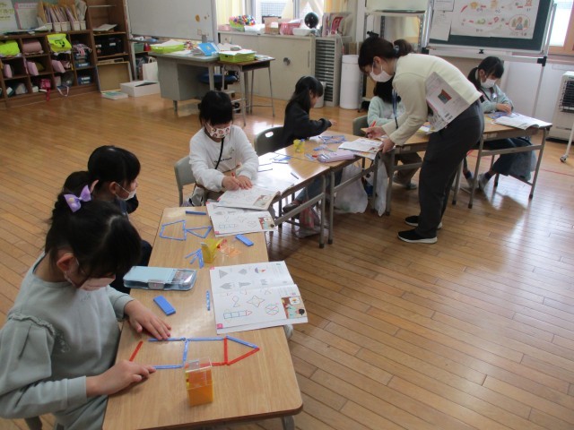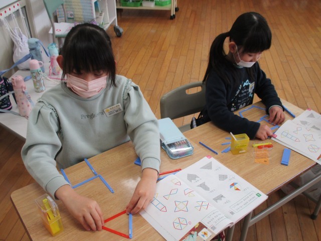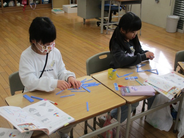 今日の算数の時間は、数え棒を並べて、いろいろな形をつくりました。教科書に載っている形を見て、同じ形に並べようとしています。三角や四角を組み合わせると、いろいろな形になりました。