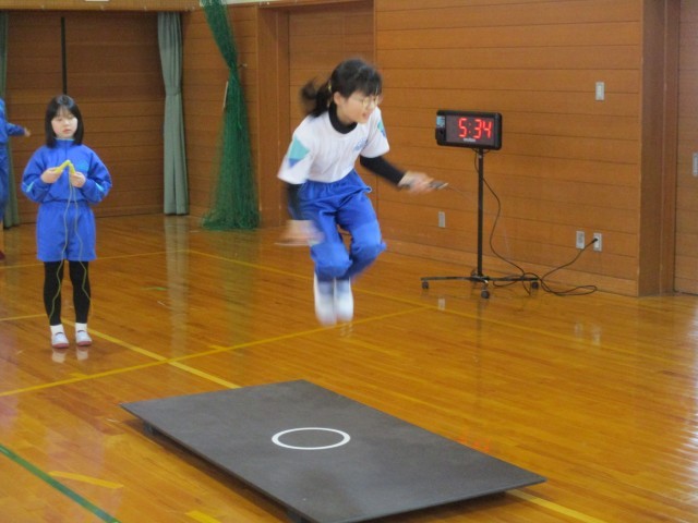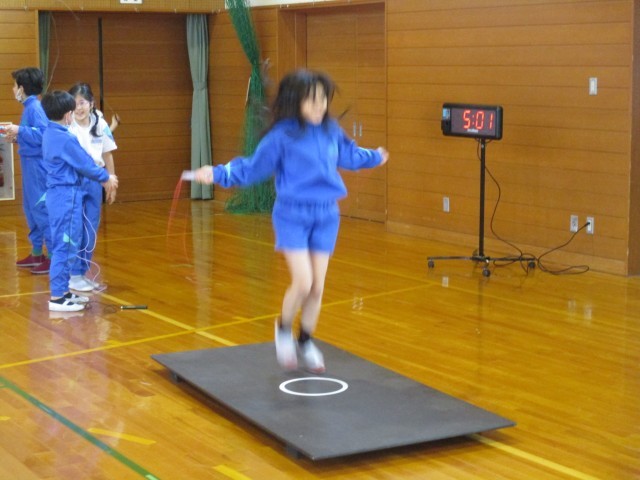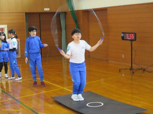 ジャンピングボードを使い、二重跳びやはやぶさ跳びに挑戦していました。ジャンピングボードがあると高く跳ぶことができるので、より高度な技にも挑戦できます。ボードがなしでもできるようにがんばりましょう。