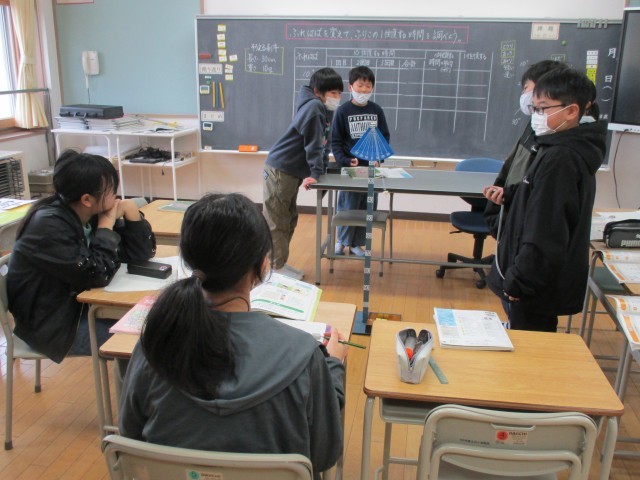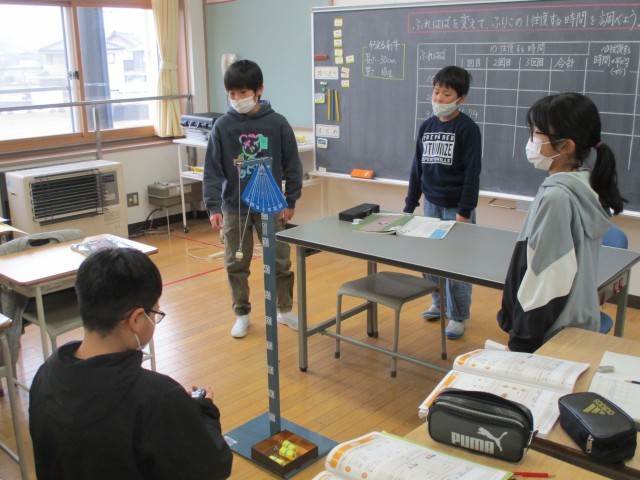 5年生は、ふりこのふれはばを変えてふりこが1往復する時間のちがいを調べる実験を行っていました。ふれはばを合わせる、ふりこをスタートさせる、時間を測る、10回数える、記録するなど、それぞれが役割をもって実験していました。