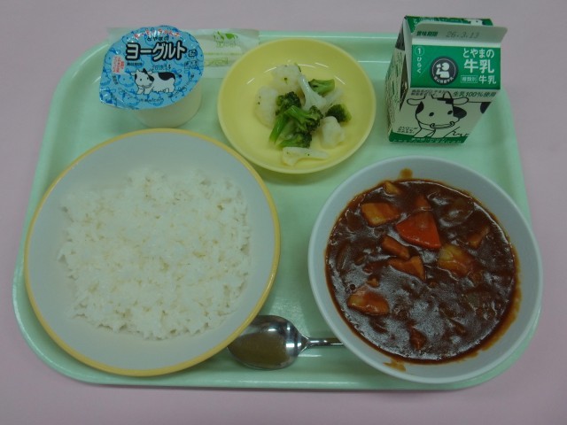 今日は子供たちも楽しみにしている食べキリンハヤシが出ています。給食のハヤシライスは、ルウだけでなく、りんご、しょうゆ、ウスターソース、赤ワイン、トマトケチャップと数種類もの隠し味が合わさって、こくがあり、大変おいしいです。きっと今日も食べキリンですね。