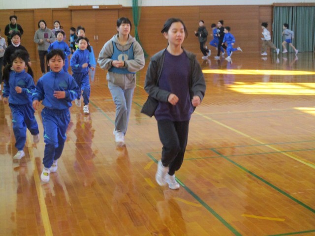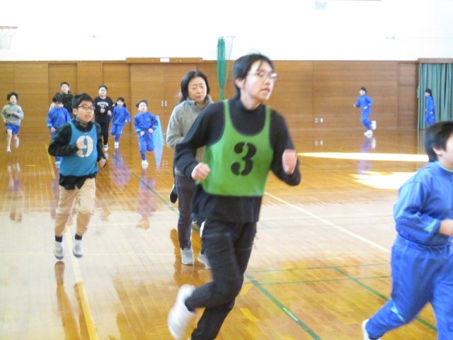 今日は、6年生と一緒に走る最後のチャレンジタイムです。6年生の走りを意識できるよう今日はビブスを付けて走ってもらいました。6年生は、小学校体育館での4分間走なので、今まで以上に力強く走っているように見えました。