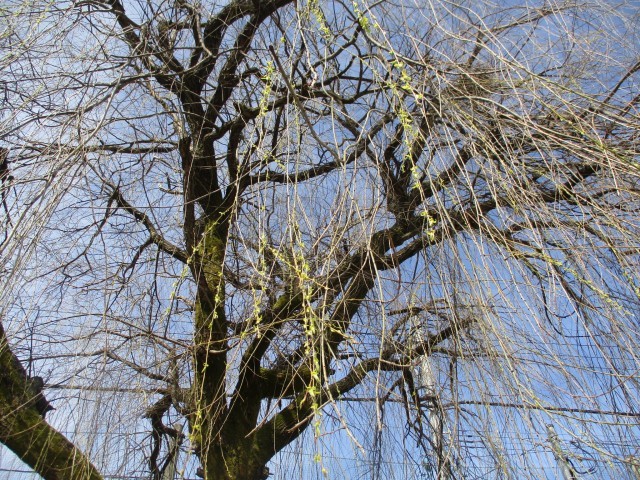 雲一つない快晴です。太陽も輝いています。柳の木も葉を広げ始めました。卒業生の最後の登校を待っています。